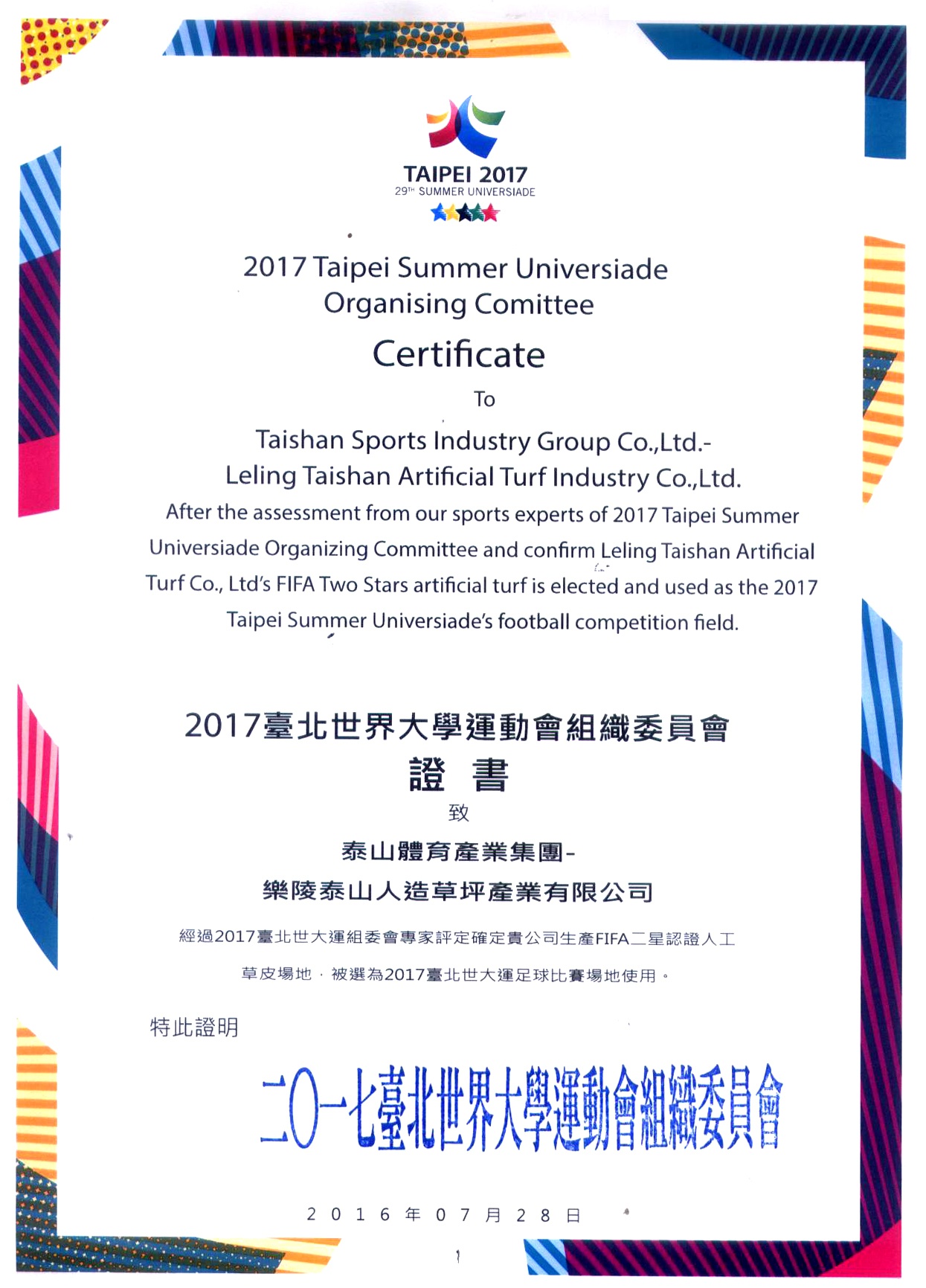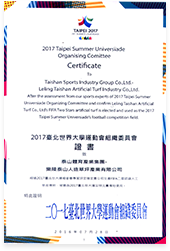 2017台北世界大学运动会组织委员会证书致乐陵K8·凯发人造草坪产业有限公司